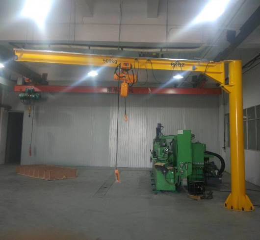 产品简介: 此款立柱式悬臂吊是潘旷起重根据客户实际标准定制生产型,悬臂为加长型,起重量为500kg。立柱高度根据厂房空间而单独设计。加长臂悬臂吊使得货物吊运范围更广,大幅度节约人力成本。 本产品由立柱,回转臂、回转驱动装置、电动葫芦组成,立柱下端通过地脚螺栓固定在混凝土基础上,由摆线针轮减速装置来驱